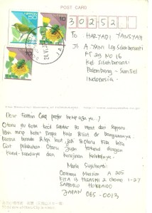 Asyiknya, di multiply aku mulai berkenalan dengan banyak anggota yang tinggal di negara lain. Dikarenakan pertemanan yang baik, beberapa mengirimiku kartu pos. Yihaaaaaa! Seneng banget rasanya. Kartu pos pertama aku terima dari mbak Mimie yang tinggal di Sapporo, Jepang. Bahkan mbak Mimie mengirimiku sebanyak 2 kali. Bahkan salah satunya berbentuk kipas yang sangat unik 🙂