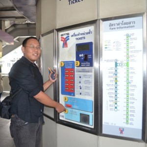 Mesinnya canggih deh. *maaf norak, di Palembang eh Indonesia belom ada (?)* Jikapun kita kasih duitnya THB 30 (@ pecahan THB 10), mesin akan otomatis kasih kembalian THB 5. Caranya pun gampang. Tinggal pencet tujuan kita mau kemana, lihat harganya, masukin koin, keluar deh karcisnya. Untuk lihat berapa tarifnya, ada tuh di samping mesinnya.