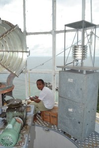 Oh ya, aku juga penasaran sama sebuah lubang yang ada di tengah-tengah menara. Dari luar terlihat gelaaaaap sekali. Aku lalu mengarahkan kamera dan… klik. Dibantu cahaya dari kamera, akhirnya aku tahu ternyata itu lubang biasa aja. Begitu kutanya sama penjaga pulau, katanya dulu lubang itu dipakai untuk menggeret tabung gas yang digunakan untuk menghidupkan lampu sorot. *anggukangguk*