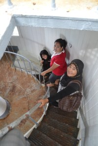 Begitu menginjakkan kaki di pantai, aku sudah nggak sabar pingin naik ke puncak Mercusuar. Ternyata, semua pada mau ikutan. Yang tinggal cuma adek Dio ditemani baby sitter aja. Ongkos naik ke menara cukup murah. Rp.5000 aja! Itupun nggak berupa tiket melainkan hanya sebuah kotak yang uangnya kita masukkan sendiri ke sana. Kotaknya juga nggak dijagain kok. Jadi kalo mau kasih lebih juga boleh. *aku sih mikir gimana cara ngembat tuh kotak. Hahaha, becandaaaaa becandaaaaaaaaa…..*