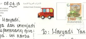 Aku paling suka kartu pos yang memperlihatkan pemandangan atau bangunan sebuah tempat. Makanya, ketika kartu pos bergambar Burj Khalifa ini sampai di Palembang dengan waktu tempuh 4 hari saja! aku senang sekali. Jadi inget, dulu abangku bergelantungan di salah satu sisi bangunan ini*