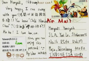 Kartu pos bergambar kartu yang sekilas mirip Chibi Maruko Chan ini juga hasil dari swap dengan postcrosser asal Taiwan. Suka dengan gambarnya yang lucu dan berwarna-warni. Walaupun sesungguhnya, aslinya kartu pos ini warnanya tidak secerah di gambar. Tapi aku tetap senang dengan swap ini.