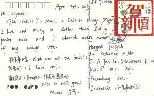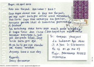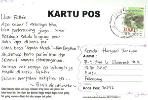 Kejutan! Benar-benar kejutan! Tidak dalam rangka apapun, kartu pos yang romantis ini dikirimkan ke rumahku karena mas Dekky –pengirim kartu pos ini dapet alamatku dari blog. Haaaaa asli aku kaget dan seneng euy! Mana kartu posnya bagus banget. Makasih ya mas Dekky 😉