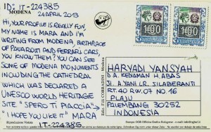 Yihaaa… ini kartu official postcrossing pertama yang aku terima dari Italia. Pengirimnya bernama Mara. Dia tinggal di Modena. Eh belakangan ketika aku menuliskan hal ini, aku baru ngeh kalo perangkonya nggak distempel hihi. Aku suka penjelasan yang ditulis oleh Mara. Apalagi ternyata katerdral yang ada di kartu pos termasuk yang warisan dunia yang dilindungi UNESCO. Asyiiikkk 🙂