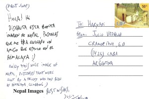 Kartu pos bergambar Annapura Himalaya ini aku dapatkan dari swap dengan seorang postcrosser dari Argentina. Aku tertarik ngajakin tukaran karena Annapura ini kan sering banget disebut-sebut di buku Titik Nol. Walaupun wujud asli kartu pos ini tak sejernih di foto tapi lumayanlah karena aku udah punya kartu pos dari Nepal ^^ Terima kasih Julio. Eh ya, kartu pos ini dikirimkan menggunakan amplop. Walau begitu tetep aja ada perangko yang ditempel di kartu posnya hihi.