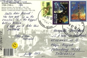 Kartu pos bergambar lonceng raksasa yang berada di kota Kremlin ini memang dikirim dari Rusia. Yang ngirim namanya Olga. Nah, yang aku suka ketika mendapatkan kartu pos salah satunya ialah yang bikin penasaran kayak kartu pos ini. Hmm, sebesar apa sih? Kalau aku disejajarkan gedean mana ya? Haha, untuk membuktikannya harus ke Kremlin langsung! Bismillah, siapa tahu kelak bisa datang ke sana. Eh ya, perangko yang dipake oleh Olga ini juga cakep. Suka sekali 🙂