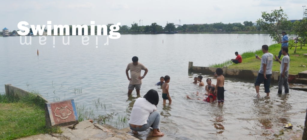Hmm, aslinya sih di danau yang berada di depan avenue menembak ini dipasang papan dilarang berenang. “Bahaya! Nanti airnya butek” gitu kata tulisannya. Ya jadi bisa dilihat kan bahwa adik-adik kiyut di atas nggak berenang. Mereka lagi main obok-obok air aja.