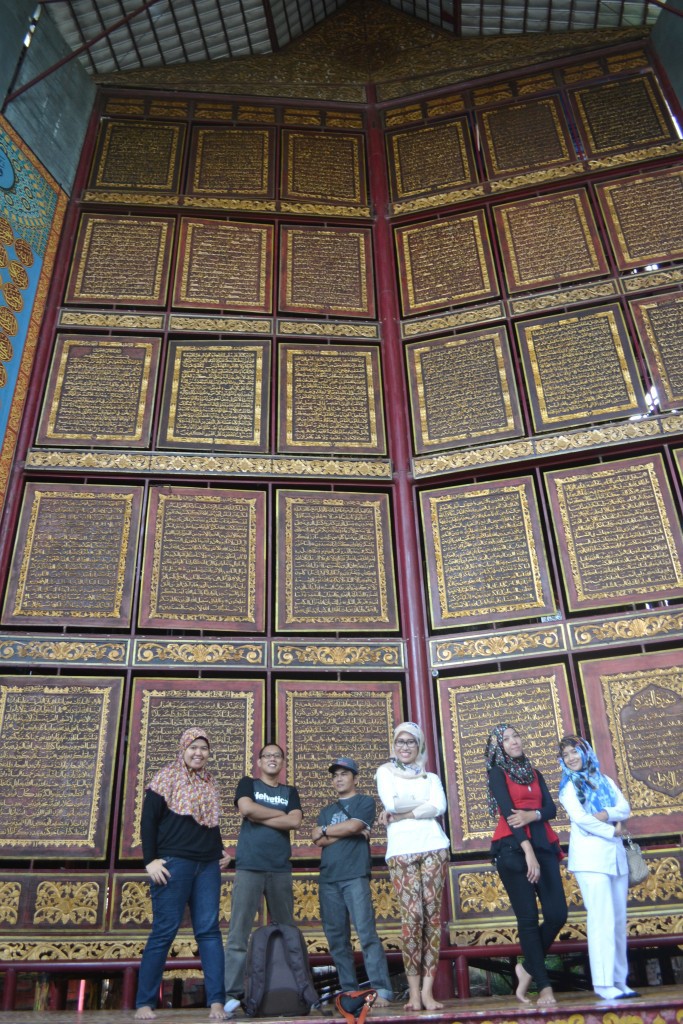 Artis KPI lainnya yang ikutan gabung itu mas Syarif. Bos besar asal Pontianak ini sudah 7 bulan bertugas di Palembang. Kebetulan banget kan? Saking pengennya ketemu Sekjen KPI, mas Syarif sampai menunda mutasinya yang seharusnya di Desember ke awal Januari. Beeuuuh. Trus, jalan kemana aja kita hari itu? Hmm nggak jauh-jauh sih. Kita mengunjungi galeri Al-Quran ukir terbesar di dunia ajaterdengar kalem ya? Padahal agak pamer sih. Hehe.