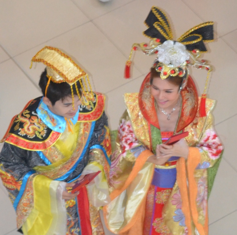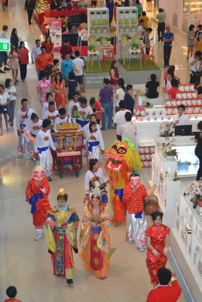 Misalnya saja rombongan parade yang memakai pakaian khas negeri Tiongkok ini. Diiringi suara music dari gendang yang ditabuhkan, mereka berkeliling mall dari lantai dasar ke lantai atas. Sambil menyuguhkan senyum manisnya, kedua remaja Bangkok berpakaian tak ubahnya raja dan ratu negeri langit –maaf, terinfluence serial Kera Sakti hihi, mereka membagikan sesuatu. Apa itu?