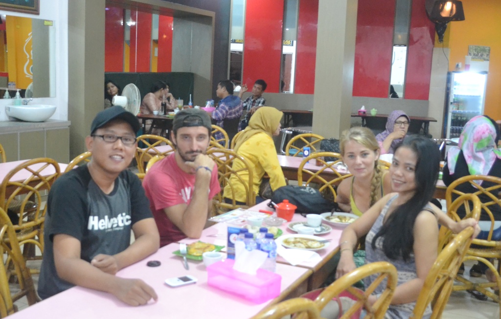 Sip baguslah. Ya namanya perut bule traveler ya, biasa nyobain makan apa aja. Bagaimana dengan Jenny? Dia lebih memilih makan model karena belum pernah mencobanya. “Very uniqe name,” katanya. Hehe, bener banget. Jangan samain sama model yang biasa berlenggak-lenggok di atas catwalk ya. Aku sendiri memesan es jeruk dan pempek lenggang. Untuk minumnya Yessy memesan es kacang merah. Nah, karena porsinya besar, satu gelas itu dimakan eh minum bertiga oleh Yessy-Jorge dan Jenny. Slrupp, enak dan segaaar.