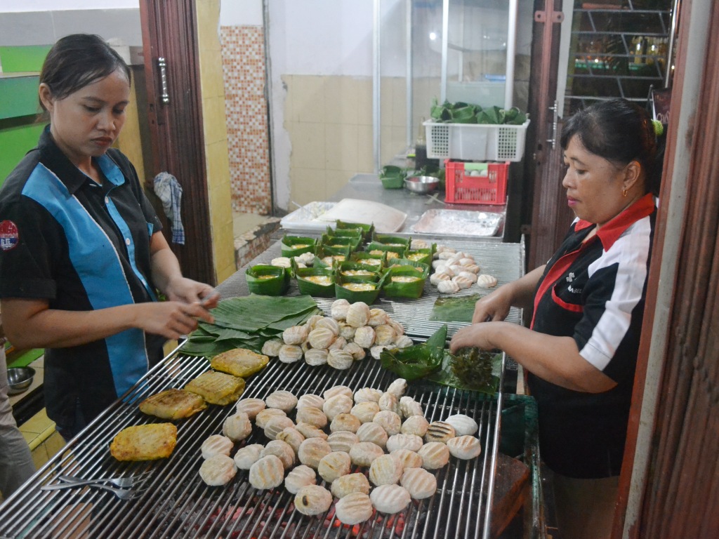 Cieh si abang pedekate. Jenny ngeliatin proses pembuatan pempek Lenggang. Tuh si ibu sedang memindahkan adonan pempek lenggang ke daun pisang lainnya.
