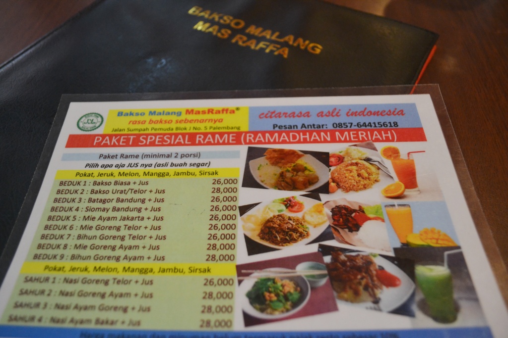 Restoran Bakso Malang Mas Raffa sangat nyaman. Lokasinya strategis, lahan parkir tersedia, tenang karena cukup jauh dari hiruk pikuk mall, staf yang cekatan dan ramah serta… harga yang terjangkau. Selain menyediakan menu bakso, restoran ini juga menyediakan menu lain seperti nasi, mie, batagor dan siomay. Pilihan minumannya juga banyak. Aneka jus tersedia dan yang penting ketika dipesan pegawainya nggak bilang, “maaf mas, stoknya kosong.” Catet!