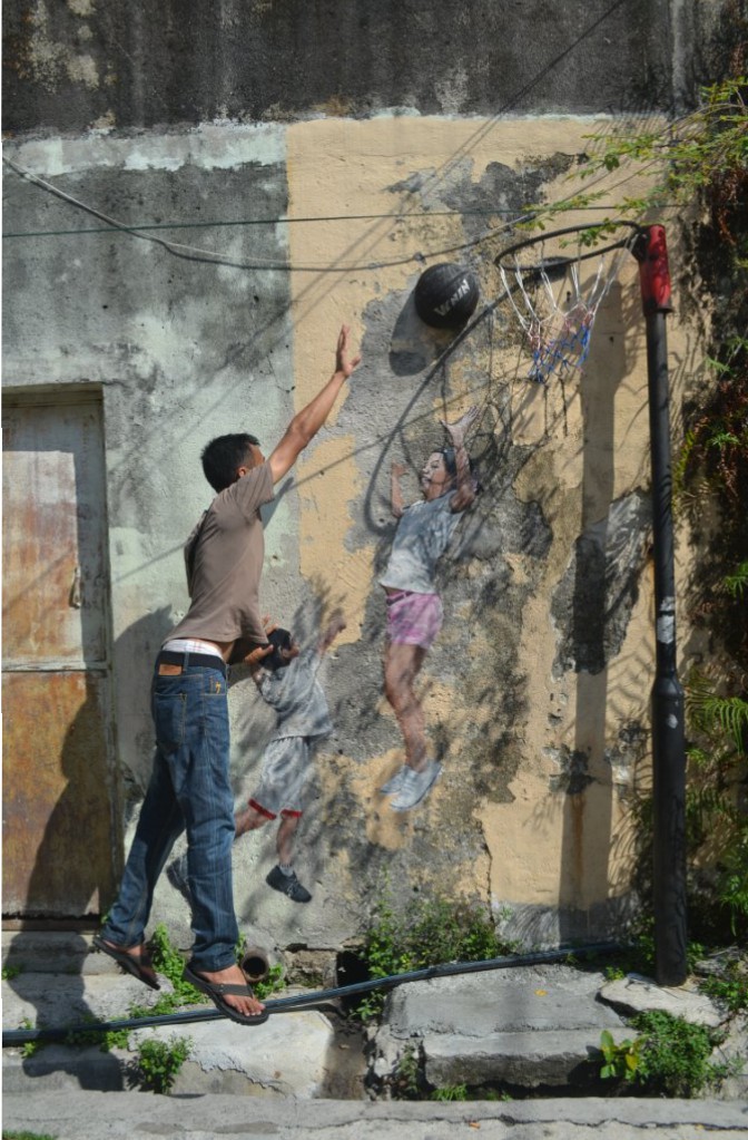 Gambar-gambar itu biasanya disatukan dengan beberapa barang sehingga membuat lukisan ini menjadi lebih “hidup”. Misalnya saja lukisan berjudul “Basketball” ini. Sebuah bola basket diletakkan di dinding sehingga pengunjung dapat berpose seolah-olah sedang memasukkan bola di ring.