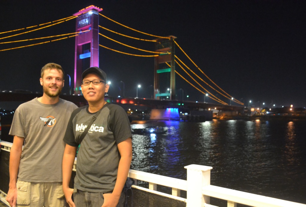 Menyenangkan bisa bertemu dengan Alid setelah sekian lama hanya saling nyeletuk di dunia maya atau blog. Mana dibawain oleh-oleh makanan sekarung pula sama Alid. Prikitiew. Ketemu Sander juga asyik. Dia bule yang sedikit berbeda. 😀 Kenapa? Soalnya dia rajin mandi, nggak merokok, bisa bangun pagi dan ngakunya 90 persen vegetarian hehe alias sangat jarang makan daging. Nah ini dia foto Alid dan Sander di dermaga sungai Musi.