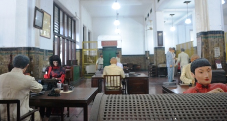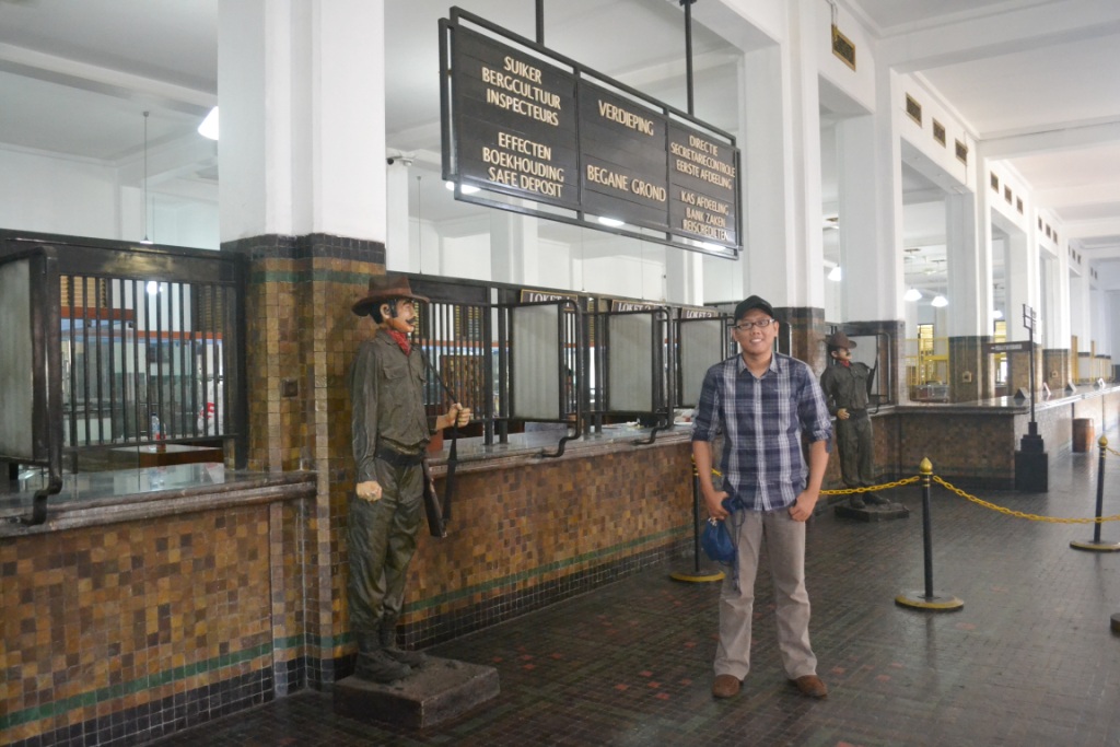 Puas berkeliling ke lantai 2, aku dan Wulan kembali ke lantai 1. Oh ya omong-omong, aku nggak tahu keadaan bank zaman dulu kayak apa. Yang jelas, kalau melihat museum ini, nasabah yang datang dibedakan berdasarkan ras. Coba lihat, bahkan ada Ruang Kasir Cina. Unik, ya? Agar suasanya semakin hidup dibuatlah patung-patung berukuran manusia yang berakting laiknya teller. Keren! –ntah kalo malam ya keren apa serem hahaha.