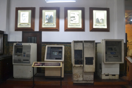 Kami terus bergerak ke bagian dalam. Di sini terdapat beberapa peralatan penunjang kegiatan perbankan. Misalnya saja mesin mesin tik jadul hingga mesin foto copy versi pendahulu. Yang paling seru itu pas ngeliat mesin ATM zaman dulu. Beuuuh, mesin ATMnya segede lemari cuy! Kayaknya kalau aku bisa sembunyi di dalamnya kalau lagi main petak umpet –lirik perut.