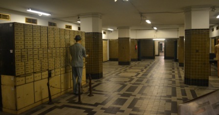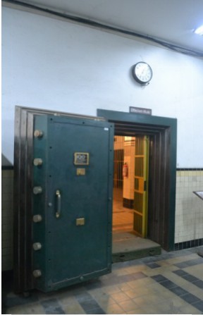 Aha! Bener juga, di mana-mana kalau bank ya pasti ada ruang khusus tempat menyimpan uangnya. Hebatnya, kluis (ruang penyimpanan uang dan surat berharga) gedung ini berada di ruang bawah tanah loh! Begitu turun ke bawah, aku langsung menemukan ruang penyimpanan safe deposit box. Ruangannya gede dan seperti penjara karena banyak terali.