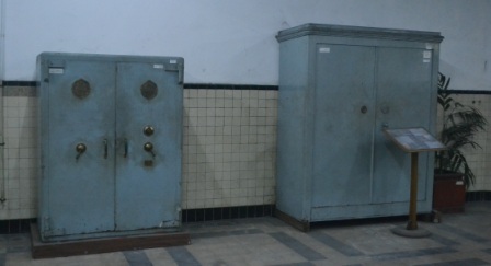 Tak jauh dari sana, ada ruang penyimpanan uang. Ampun, ruangannya gede banget! Sambil melihat-lihat, aku membayangkan bagaimana dulu keadaan ruang ini saat masih digunakan. Pasti banyak banget uang yang disimpan di sini. Tingkat keamanannya juga tinggi. Tebal pintunya aja setengah meter ada kali. Di sini juga ada contoh lemari uang yang dibuat dari besi/baja. Rata-rata lemari besi seperti ini masih dipergunakan hingga sekarang.