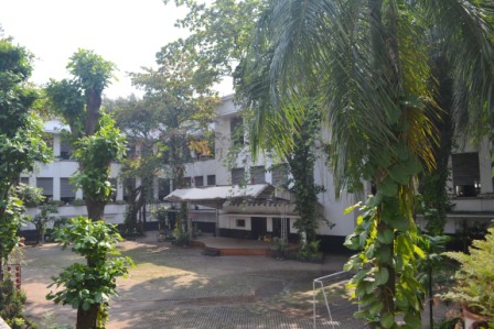 Eh ya dari teras lantai 2, aku bisa melihat halaman dalam (di dalam ya, bukan belakang. Ya sebagaimana umumnya bangunan Eropa, mereka punya taman di tengah-tengah gedung). Di halamannya terdapat pohon-pohon tua. Sama sekali nggak terkesan angker –ya karena siang hari kali :p malah keberadaan pohon-pohon tersebut bikin suasanya makin nyaman dan cuaca menjadi teduh.