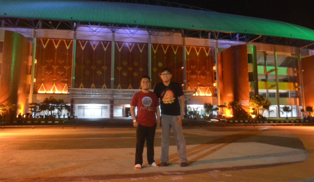 Nah, ketika udah separuh kenyak 😀 kita jalan lagi. Biasanya sih aku ngajakin temen itu ke Jembatan Ampera. Nah berhubung mas Hendra belum pernah main ke wilayah Ulu, jadilah aku ngajakin mas Hendra ke komplek Stadion Jakabaring yang gede itu. Walaupun malem, ternyata lumayan banyak orang yang duduk-duduk ngadem di sini. Kita pun nggak mau ketinggalan dong foto bareng. Kapan lagi, kan? 🙂