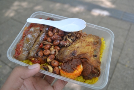 Sebetulnya sih jika dibandingin sama nasi padang, harganya 4 kali lipat. Namun harga tersebut cukup pantas untuk ukuran Hong Kong. Aku memilih nasi kuning + ayam seharga HKD 26 sedangkan Ilham memilih nasi putih + ayam bakar dengan harga yang sama. Setelah makanan di dapat, kami memutuskan kembali ke Victoria Park dan makan di sana saja.