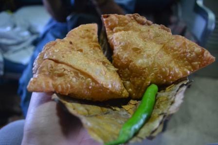 Sebetulnya ada. Jika kereta berhenti di stasiun di sepanjang perjalanan, biasanya pedagang akan masuk ke dalam dan menawarkan dagangannya. Namun jarang yang menjual nasi. Paling banyak menjual Samosa, yakni makanan sejenis pastel yang berisi adonan kentang dan kari. Rasanya? Ya begitulah.