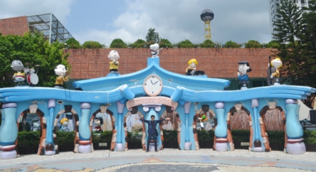 Itu dia gerbangnya. Patung Snoopy raksasa ada di bagian atasnya.
