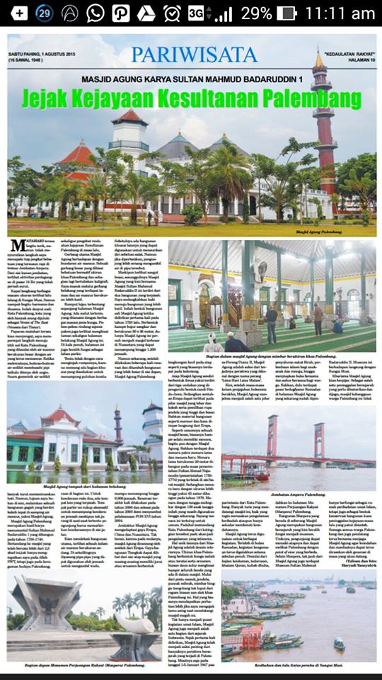 Masjid Agung Palembang merupakan hasil karya monumental Sultan Mahmud Badaruddin 1 yang dibangun pada tahun 1738-1748. Bertandang ke masjid yang telah berusia lebih dari 2,5 abad ini,tak hanya mengingatkan saya pada Allah SWT, tetapi juga pada keragaman budaya Palembang, sekaligus pengobat rindu akan kejayaan Kesultanan Palembang di masa lalu.