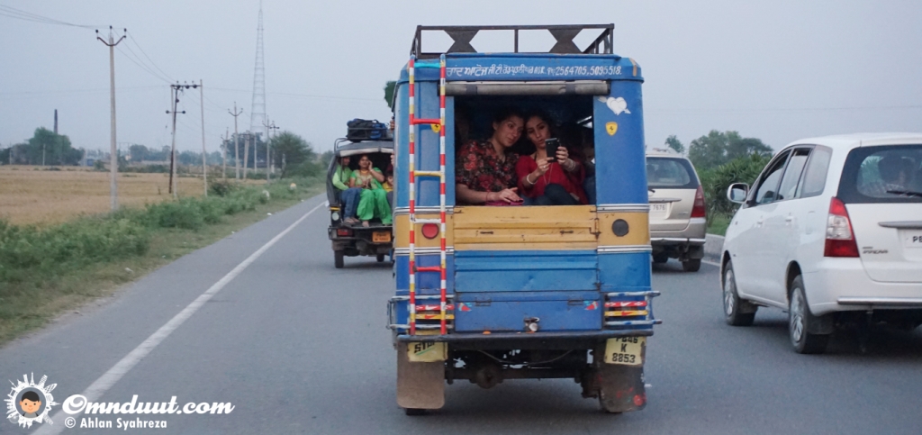 Kami mendapatkan bajaj tepat di pinggir jalan mall Trilium. Satu lagi keistimewaan Amritsar. Bajajnya berukuran sangat besar. Paling besar selama kami melakukan perjalanan di 7 kota lainnya di India. Rekor yang kami lihat, satu bajaj itu bisa muat 15 orang! Hah kok bisa? Iya, soalnya bemper belakang dapat diduduki 4 orang. 8 orang duduk berhadapan di bagian tengah dan masing-masing 1 orang berada di sisi kanan dan kiri supir. Bisa lebih banyak jika ditambah anak kecil dan bayi. Nah, unik, kan? 🙂