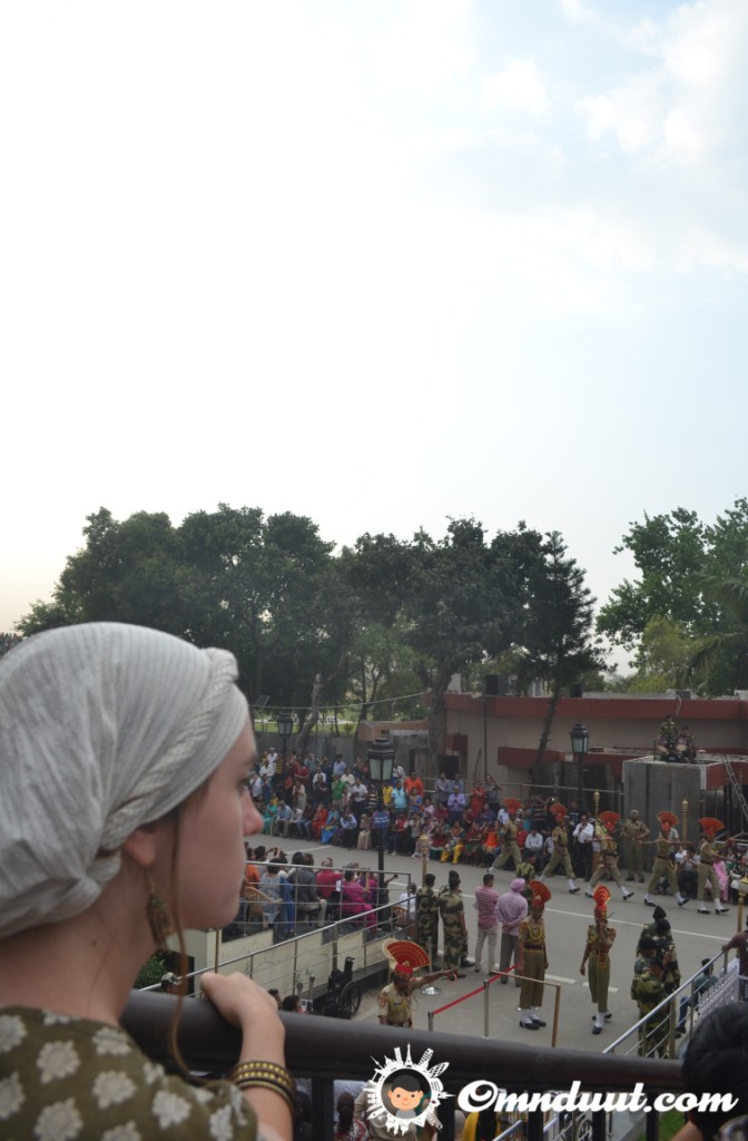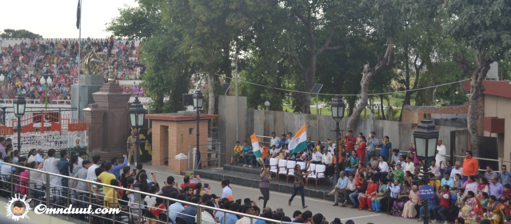 Beberapa penonton peremuan dipilih untuk berlari dari ujung lapangan menuju gerbang perbatasan. Wanita-wanita ini berlari sambil membawa bendera India. Mereka begitu bersemangat dan sepertinya tanpa lelah. Ada beberapa bendera yang dipegang secara bergiliran. Selagi seseorang berlari bersama bendera, sisanya menunggu dengan berjoget. Meriah sekali.