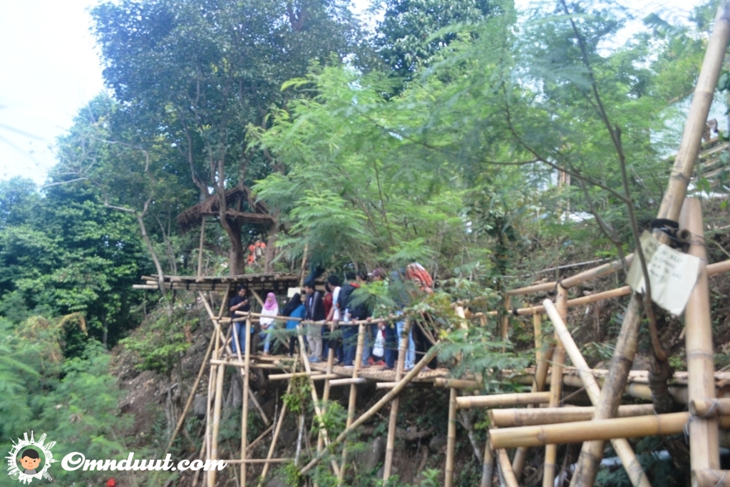 Puas main-main di zona pertama, aku menjajal zona lainnya. Zona ini terletak di bagian bawah bangunan utama. Tak jauh dari situ ada bangunan yang terbuat dari bambu. Jalan menuju ke sana pun berupa jerambah yang tersusun dari batangan bambu. Sepertinya itu tempat paling kece namun karena antriannya cukup panjang, aku memutuskan untuk menjajal area lainnya saja.