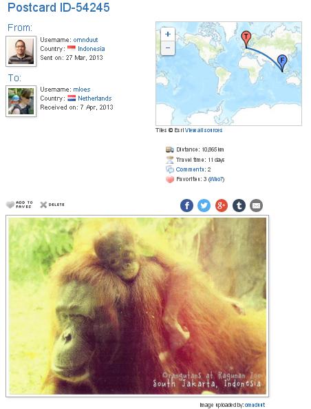 Misalnya saja seorang ibu bernama Jean yang tinggal di Paris. Dia mengirimkan pesan pribadi dan memohon agar aku dapat mengirimkan kartu pos orangutan untuk anaknya yang sedang gemar-gemarnya mengumpulkan info tentang orangutan. Dengan diiringi rasa haru, meluncurlah sebuah kartu pos untuk anaknya. Begitu kartu pos diterima, Jean kembali menghubungiku dan mengucapkan terima kasih. Oh co cuit!