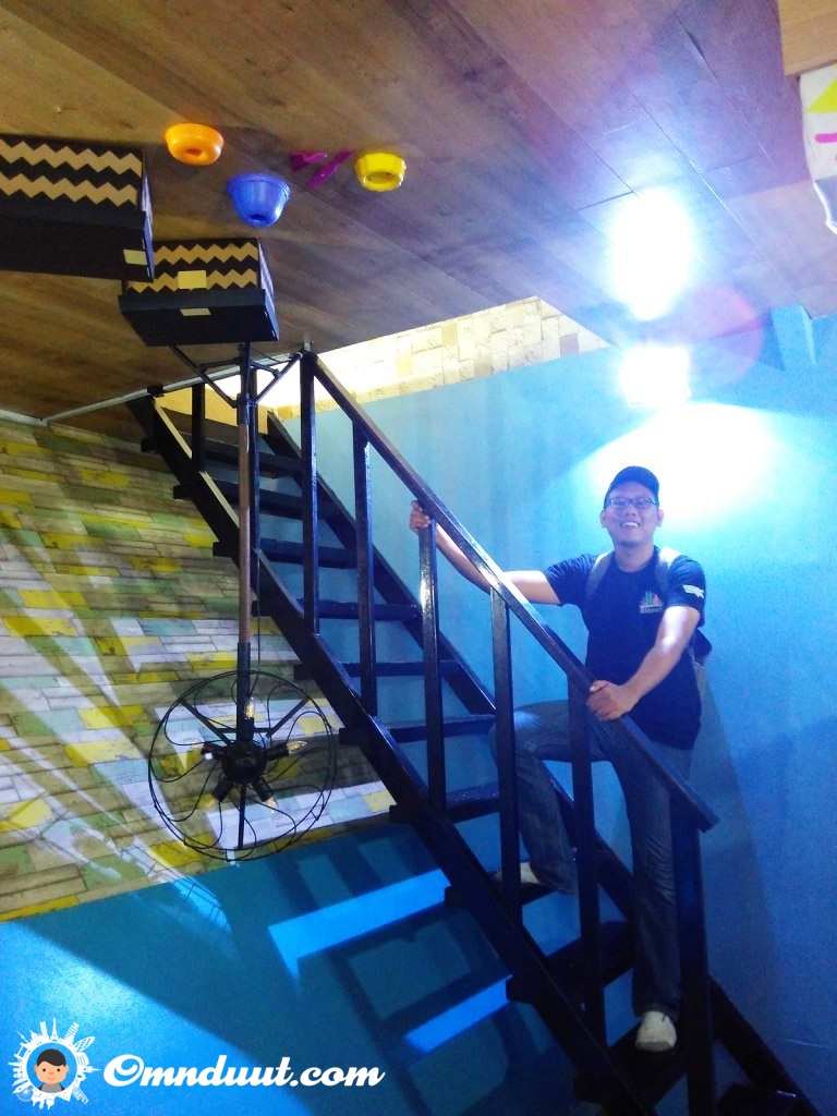 Berhubung kami ke sana rombongan, demi kenyamanan jumlah pengunjungnya dibatasi. Jadi kami masuknya secara bergantian. Serunya lagi, di masing-masing ruangan terdapat gambar petunjuk bagaimana mengambil foto dengan benar. Maklum saja, namanya juga terbalik, kan? Untungnya lagi di dalam ada petugas yang bersedia membantu pengunjung dan bersedia mengarahkan (bahkan membantu motret) demi mendapatkan pose kece seperti ini! Hehehe.