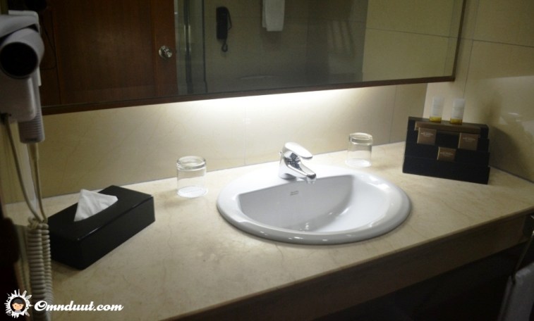 Terdapat sebuah kursi yang kulitnya mulai terkelupas. Oh well, aku bukan penghuni yang cerewet. Namun, terus terang keadaan ini bikin kaget juga. Secara, ini hotel bintang 5, gitu! Begitu melirik ke kamar mandi, toiletries-nya ditempatkan di sebuah wadah dengan kerak sabun atau odol yang masih menempel. Hmm.
