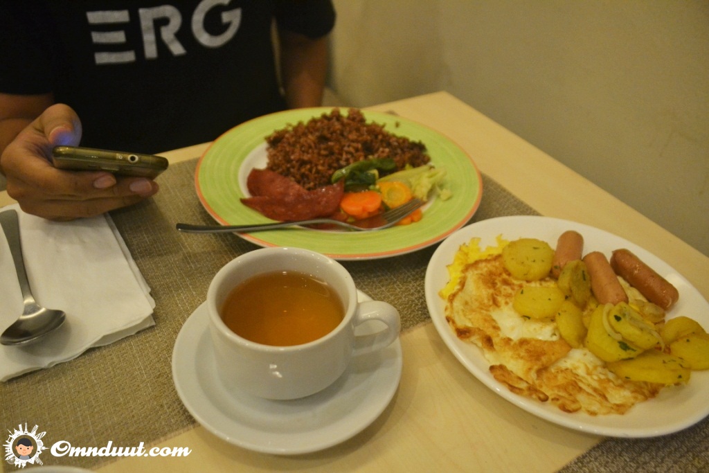 Bagaimana dengan menu yang disajikan oleh hotel ini? Lumayan juga walaupun tidak ada satu yang terasa begitu istimewa dengan menu-menunya. Aku memilih bersantap sahur dengan nasi putih, ikan tim dan omelette alias telor dadar. Ari memilih untuk icip nasi merahnya. Rasanya? Standar aja.