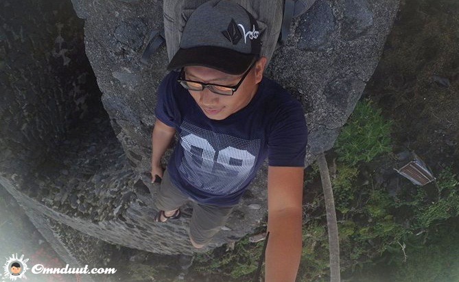 Seketika aku memutuskan untuk duduk dengan kaki menjuntai. Menikmati senja yang romantis di Torre. Ah sayang, nggak ada dik Chelsea Islan di sampingku. Kalau ada kan enak, bisa diajakin main congklak. Selanjutnya, aku langsung asyik utak-atik kamera aksi yang aku punya. Niat hati ingin mengulang pose yang sama, seperti yang dulu aku lakukan di Twin Tower, KL, aku menjajal pose baringan tepat di antara lubang dan “jurang” Benteng Torre.