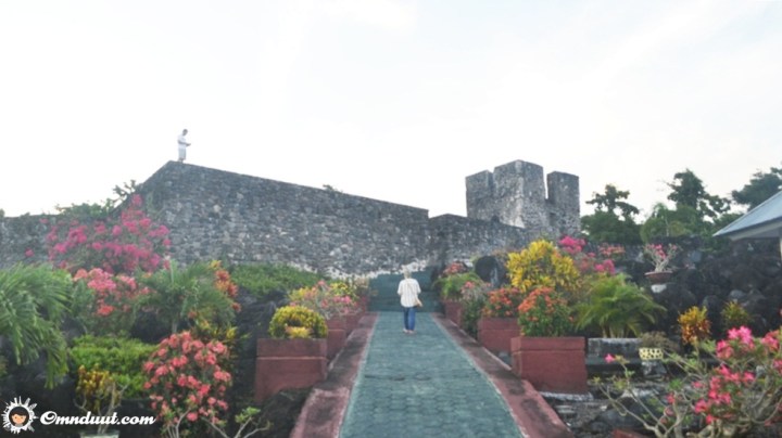 Nampak sebuah pondok kecil tak jauh dari sana, menurut hemat pemikiranku, bisa jadi sebagian lahan yang ada di sana digunakan warga untuk menanam buah dan sayuran. Bonusnya, terdapat bunga-bunga indah juga di sekitaran benteng ini. Untuk mendapatkan foto yang baik, kami harus berjalan menuju undakan atas dan duduk atau berdiri tepat di tepian dinding utama benteng.