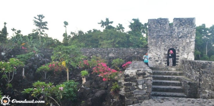Melihat panorama yang sedemikian cetar, gak butuh lama, kami semua lantas mulai mengoperasikan kamera masing-masing. Aku mengedarkan pandangan ke sekeliling. Banyak batu-batu hitam berukuran besar berada di sekitaran Benteng Torre. Beberapa pohon juga nampak berada di sela-sela bebatuan. Paling banyak sih pohon pepaya dan pisang, ya.