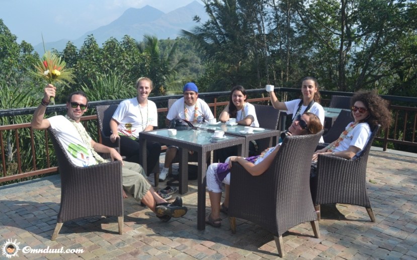 Jarak yang ditempuh tidak begitu jauh. Sekitar 20 menit menggunakan mobil. Serunya, saat menuju ke sana, kami dihadiahi pemandangan kota Wayanad yang asri dengan hamparan kebun teh di beberapa kawasan. The Windflower sendiri letaknya di atas bukit. Jalan menuju ke atas lumayan berkelok. Begitu tiba di gedung utama, kami disambut oleh pemilik dan jajaran stafnya.