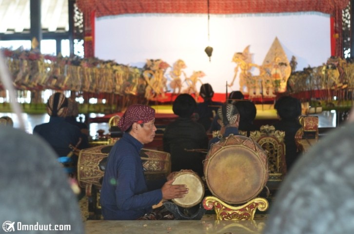 Dari balik layar pertunjukkan wayang di area keraton. Berbagai macam instrumen musik ditabuhkan di sini.