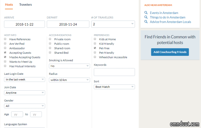 Langkah selanjutnya, lakukan filter. Nah, ini terobosan baru yang diberikan oleh CS kepada penggunanya. Jadi, melalui fitus filter ini, kita dapat menyaring host seperti apa yang kita cari. Mula-mula, masukkan tanggal kedatangan dan tanggak kepulangan yang kita butuhkan. Di bagian #Of Travelers, saya masukan angka 2 karena memang saya datang bersama adik.