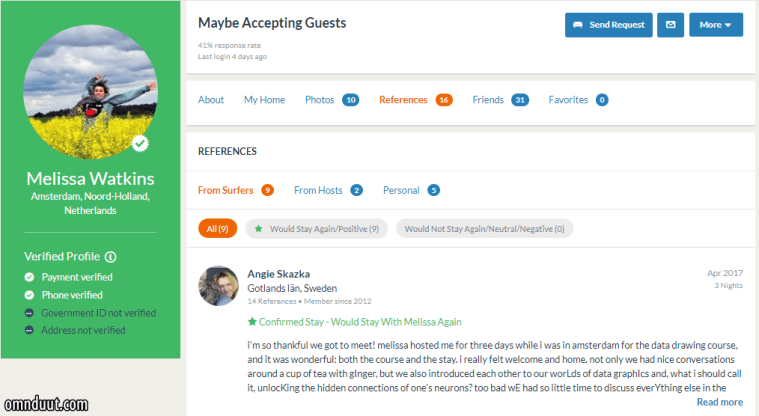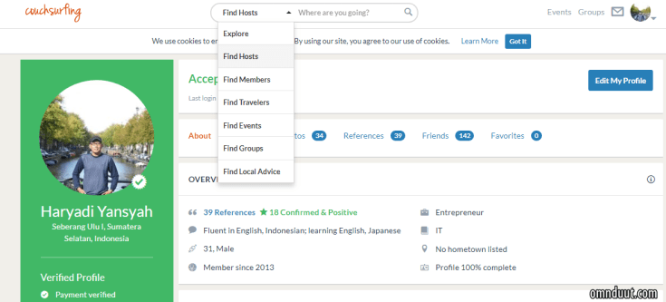 Jika kamu melihat tanda centang di profil seseorang seperti punya saya, itu artinya member CS tersebut telah melakukan verifikasi dengan cara membayar kepada couchsurfing. “Jadi, jika sudah verifikasi artinya lebih terpecaya ya?”
