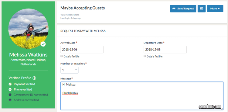 “Hi, saya akan berada di Paris di tanggal tersebut, boleh numpang nggak?” Ada loh yang kasih pesan template kayak gitu. Sekali lagi, ini yang mau kita tumpangi bukan penginapan, tapi rumah orang. Jadi, kirimlah pesan dengan lebih baik dan sopan jika emang mau ditumpangi oleh si calon host.