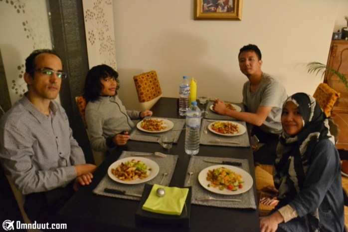 Di malam pertama, kami meminjam dapurnya untuk masak nasi goreng (saya sudah jago memasak nasi dengan panci haha). Dia makan dengan lahap dan malam selanjutnya gantian dia yang berbelanja dan memasak ‘mushroom with paprika souce’ yang lagi-lagi kami makan dengan… nasi hehehe.