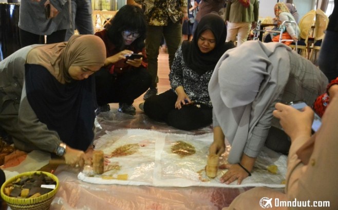 Setelah masak dan makan bersama, selanjutnya giliran Anggi dari Galeri Wong Kito yang akan menunjukkan kebolehannya membentuk pola pada sebuah kain menggunakan bahan-bahan alami dari alam. Bagaimana tidak, Anggi menunjukkan kebolehannya membentuk pola dengan memanfaatkan dedaunan yang berada di sekitar kita!