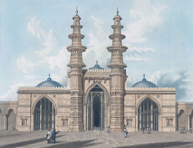Jama Masjid with minarets, drawn in 1809 by Robert Melville Grindlay. Source Wikipedia.