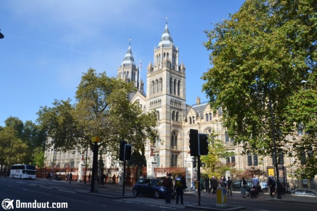 Dengan menggunakan tube dari kediaman host, saya tiba di stasiun Kensington dan hanya butuh berjalan kaki sebentar untuk menjangkau keberadaan museum-museum yang terletak berdampingan ini. Tujuan pertama saya ke Natural History Museum, yakni museum yang dibangun pada tahun 1873 hingga tahun 1880. Walau begitu, museum ini baru dibuka setahun kemudian dan proses kepindahan koleksi benar-benar baru selesai pada tahun 1883.
