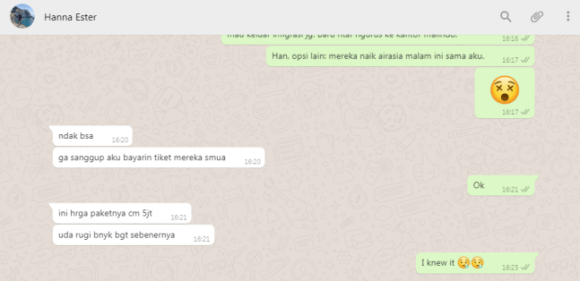 Saya mengerti kepanikan rombongan. Mereka pasti bingung dan nggak paham buat ngapain. Sedangkan, saya sebagai TL berada di pesawat lain dan mendarat di terminal yang berbeda dengan mereka. Untung Hanna dari jauh berusaha menenangkan. Sesuai arahan Hanna, mereka berusah mencari kejelasan.
