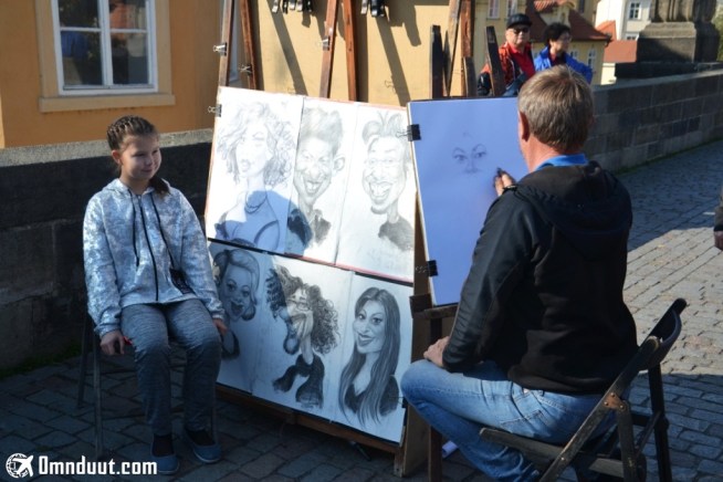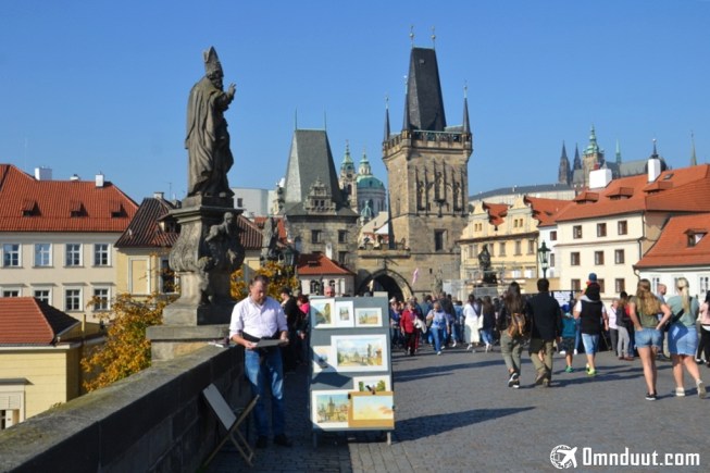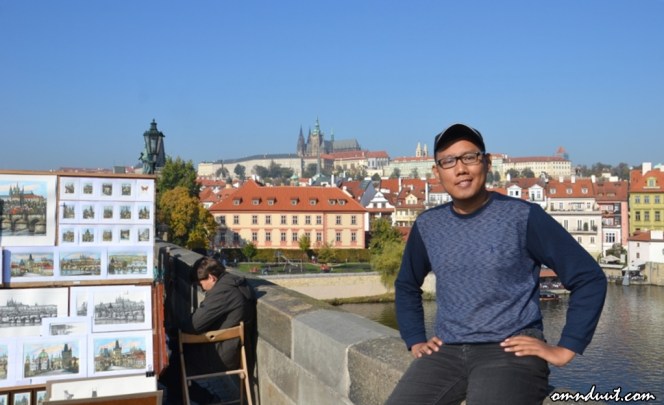 Saya menyesal tak datang ke sini lebih pagi. Kenapa? Soalnya jam segitu ternyata Jembatan Charles udah rame banget. Susah mau foto tanpa bocor. Di sepanjang jembatan juga banyak para pekerja seni yang “ngelapak”. Diantaranya para pelukis dan para pembuatan kerajinan tangan. Di beberapa bagian juga nampak pengamen yang membawa alat musik.