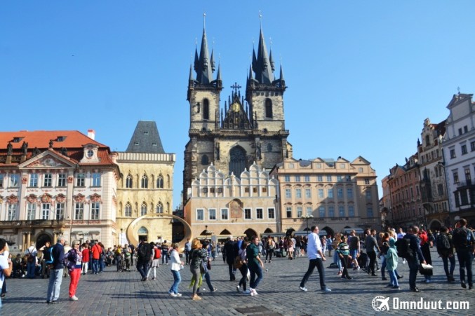 Tiba di bawah niatnya mau cari tempat duduk buat santai sejenak. Tapi penuh euy. Ari saya suruh melipir dulu sedangkan saya mengambil foto. Saya berkeliling di sekitaran alun-alun dan mendapati beberapa gedung bersejarah. Seperti The Church of Mother of God before Tyn yang kedua menaranya menjulang “menembus” langit Praha.